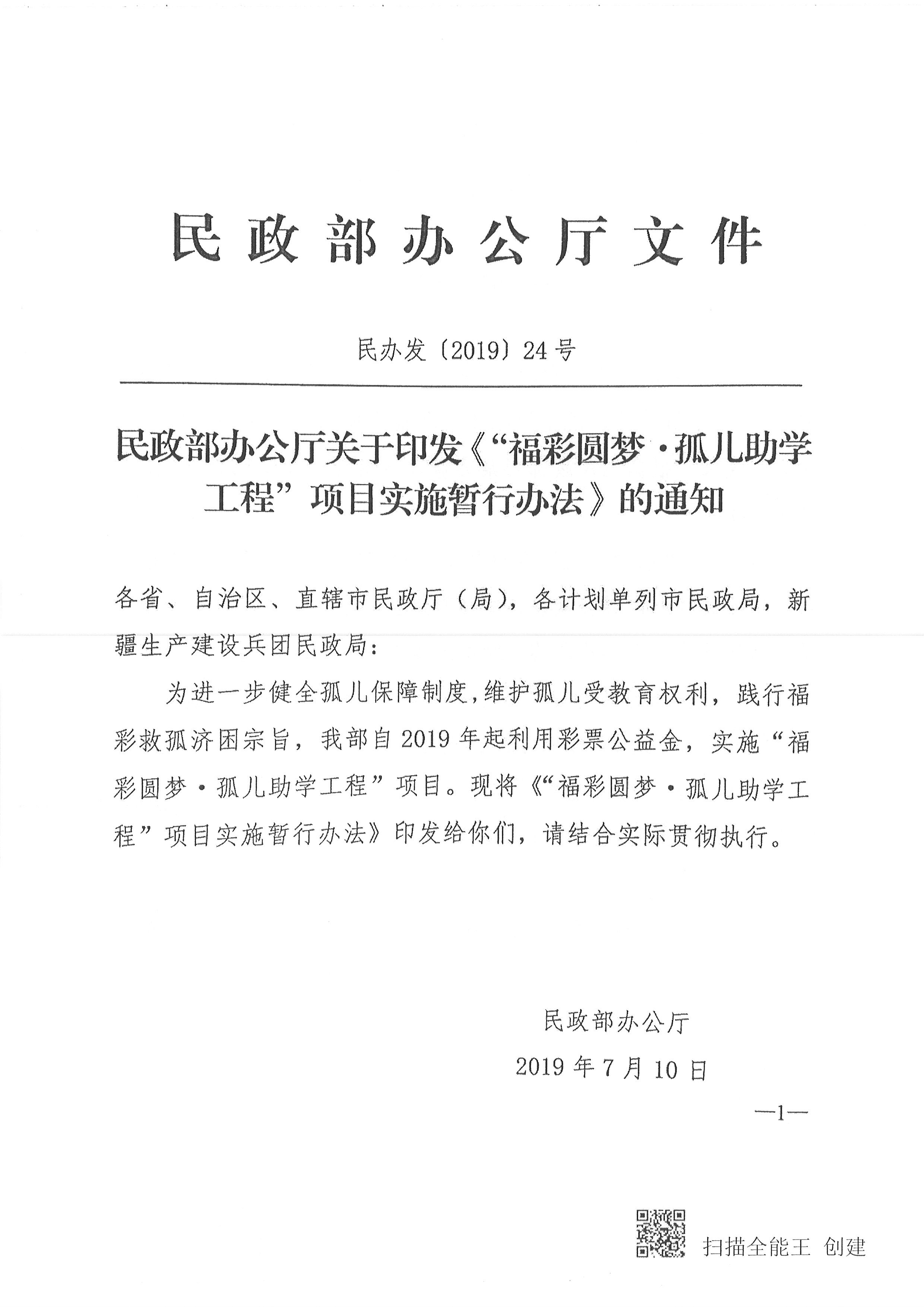 从2019年7月10日起,民政部实施的“福彩圆梦·孤儿助学工程”项目,是进一步健全孤儿保障制度,维护孤儿受教育权利的重要举措。各区县(自治县)要高度重视,认真组织实施。要利用互联网、媒体等平台,大力宣传《“福彩圆梦·孤儿助学工程”项目实施暂行办法》(以下简称《暂行办法》),做到家喻户晓。